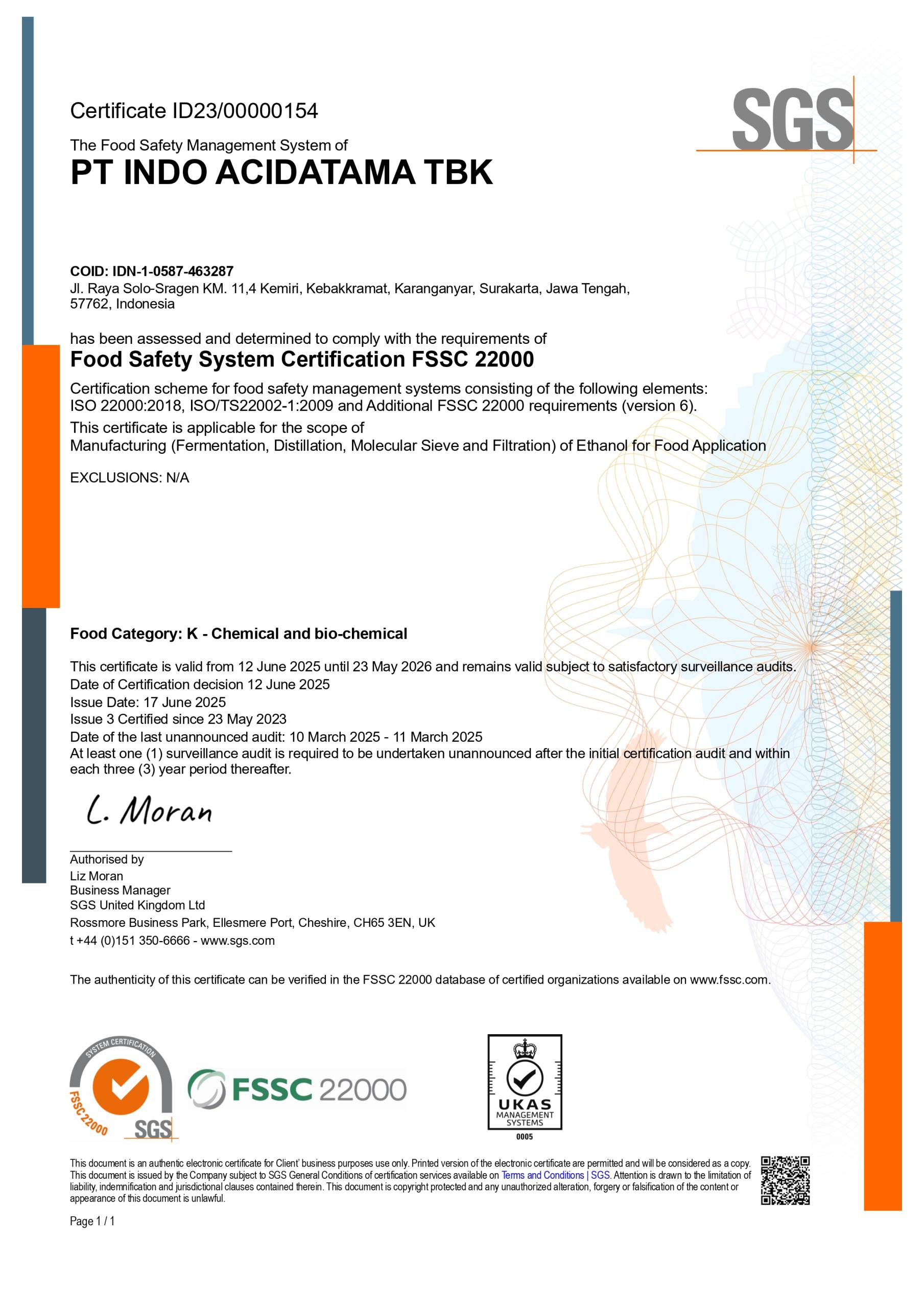 Pada tahun 2023 Perseroan mendapatkan sertifikat FSSC 22000 (Food Safety System Certification 22000) adalah standar yang diterima secara global yang mencakup persyaratan untuk inspeksi, pengawasan, dan sertifikasi untuk memastikan keamanan pangan perusahaan di semua tahapan makanan.
